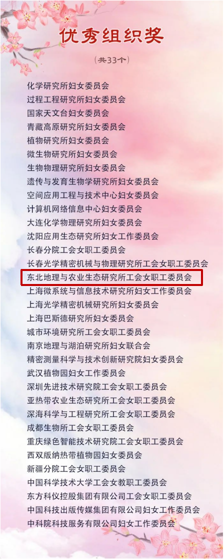7月7日,中國科學院婦女工作委員會、中國科學院工會女職工委員會公布了2022年“科苑女性活動月”獲獎名單,在全院各級婦女組織中,評選出優秀組織獎33個,十佳人氣獎10個。其中東北地理與農業生態研究所工會女職工委員會榮獲"優秀組織獎"和"十佳人氣獎"。