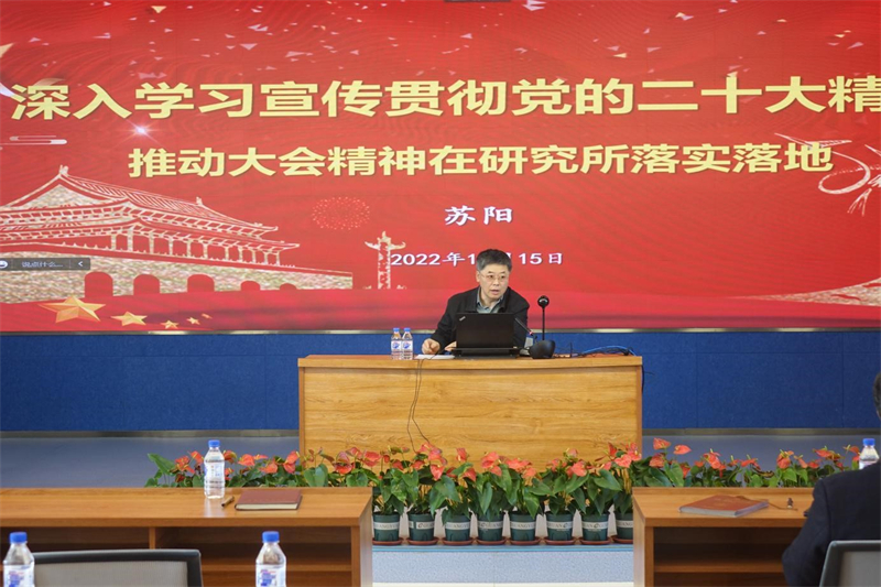 會上,蘇陽介紹了中國共產黨第二十次全國代表大會的概況,并結合本所實際工作從重要意義、偉大成就、目標任務、謀劃部署、責任使命5個方面對黨的二十大精神進行了詳細解讀。對標黨中央學習要求、院黨組學習部署,對本所學習宣傳貫徹黨的二十大精神進行了系統(tǒng)部署。