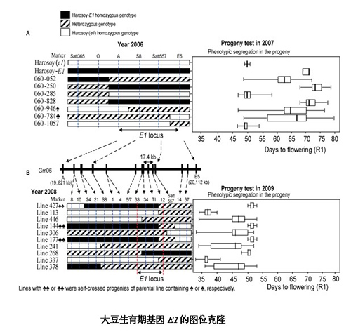 大豆分子設(shè)計育種重點實驗室夏正俊研究員及其合作者,歷經(jīng)九年,通過圖位克隆法成功地破譯大豆光周期反應(yīng)的中樞調(diào)節(jié)基因E1,并對其進(jìn)行了功能驗證。研究結(jié)果表明E1基因是豆科作物特有的轉(zhuǎn)錄因子,揭示了大豆具有獨特的光周期調(diào)控開花網(wǎng)絡(luò)。主要研究結(jié)果發(fā)表在2012年P(guān)roc Natl Acad Sci USA 109(32): E2155–E2164 (doi:10.1073/pnas.1117982109),被國內(nèi)外大豆研究者及育種家評論為在大豆光周期反應(yīng)研究中一個重要里程碑。