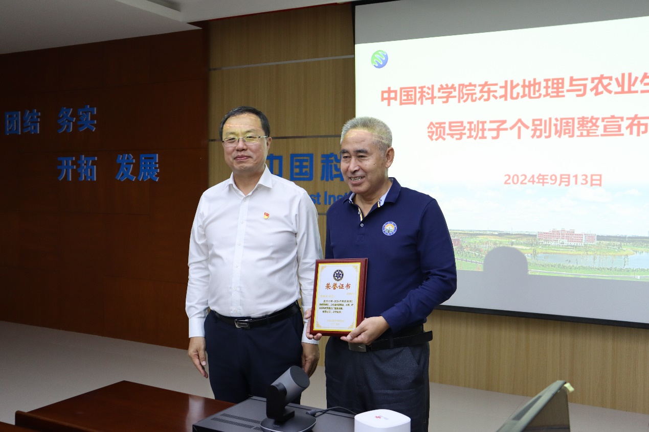 長(zhǎng)春分院分黨組書記、院長(zhǎng)金宏宣讀了《中共中國(guó)科學(xué)院黨組關(guān)于李秀軍同志免職的通知》(科發(fā)黨任字〔2024〕120號(hào)),免去李秀軍同志東北地理與農(nóng)業(yè)生態(tài)研究所副所長(zhǎng)職務(wù),保留副局級(jí)。金宏為李秀軍同志頒發(fā)榮譽(yù)證書,感謝其擔(dān)任所(局)級(jí)領(lǐng)導(dǎo)期間為中國(guó)科技事業(yè),為院、所改革和發(fā)展做出的重要貢獻(xiàn)。