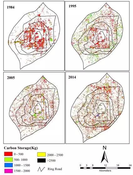 研究團(tuán)隊(duì)?wèi)?yīng)用遙感與實(shí)地測(cè)量相結(jié)合的方法,構(gòu)建了城市森林碳儲(chǔ)量時(shí)空估測(cè)模型,揭示了快速城市化過程中城市森林結(jié)構(gòu)及其碳儲(chǔ)量的時(shí)空演變規(guī)律。研究發(fā)現(xiàn),快速城市化過程中,城市森林覆蓋度總體呈現(xiàn)出逐漸增加的變化趨勢(shì),但其斑塊破碎化逐漸加重;城市森林郁閉度、葉面積、基部斷面積等都呈現(xiàn)出逐漸降低的變化趨勢(shì)。在城市森林減緩碳排放方面,研究團(tuán)隊(duì)明確了快速城市化過程中城市森林在應(yīng)對(duì)城市碳排放中的貢獻(xiàn):在1984~2014年間城市森林碳儲(chǔ)量逐漸增多(大多集中于郊區(qū)),其年增加量為6Gg,可抵消年增加CO2排放量的4%。城市森林碳密度呈現(xiàn)出從郊區(qū)到中心逐漸降低的變化趨勢(shì),但隨著時(shí)間的推移,城市森林質(zhì)量有所提高,城市森林碳密度逐漸升高。