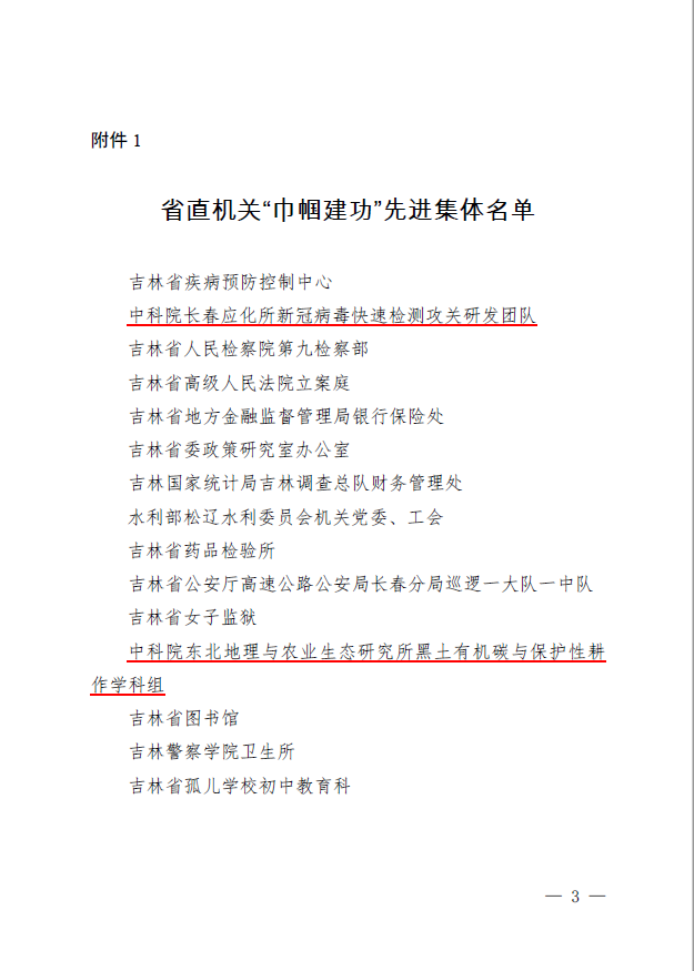 近日,吉林省直婦工委對吉林省直機關“巾幗建功”先進集體和先進個人進行了表彰,在受表彰的15個“巾幗建功”先進集體中,中科院長春分院組織推薦的“長春應化所新冠病毒快速檢測攻關研發團隊”和“東北地理所黑土有機碳與保護性耕作學科組”2個集體均被授予吉林省直機關“巾幗建功”先進集體榮譽。
