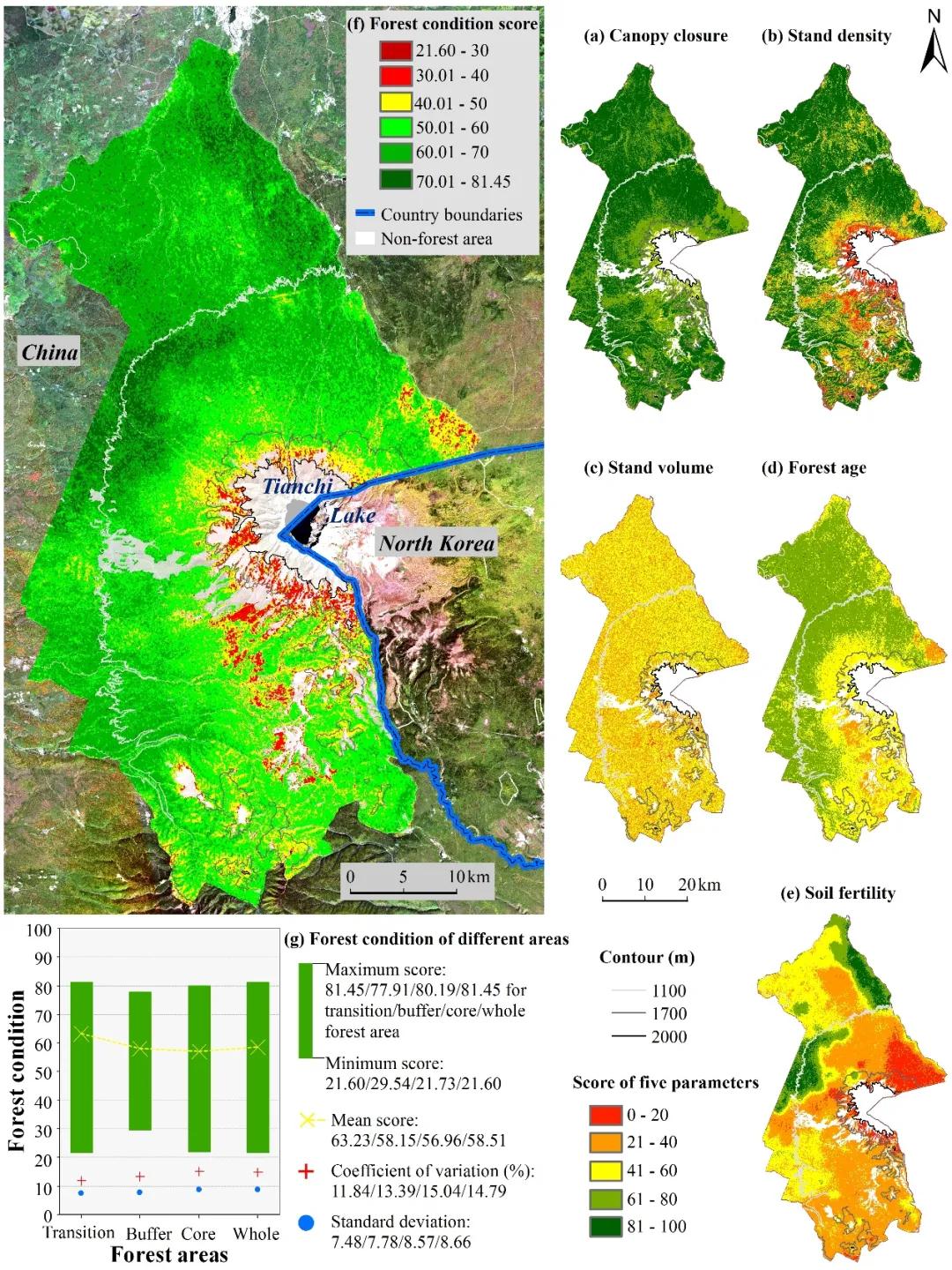 該研究系統分析了遙感因子與各參數的關系,并通過統計回歸、隨機森林、隨機森林克里金等遙感建模方法,反演獲得長白山國家自然保護區林齡、郁閉度、立木密度、蓄積量和土壤肥力等參數的空間分布;在此基礎上,利用主成分分析法確定各參數權重,繪制了長白山國家自然保護區森林健康狀況空間分布,并對評價結果進行了不確定性分析。
