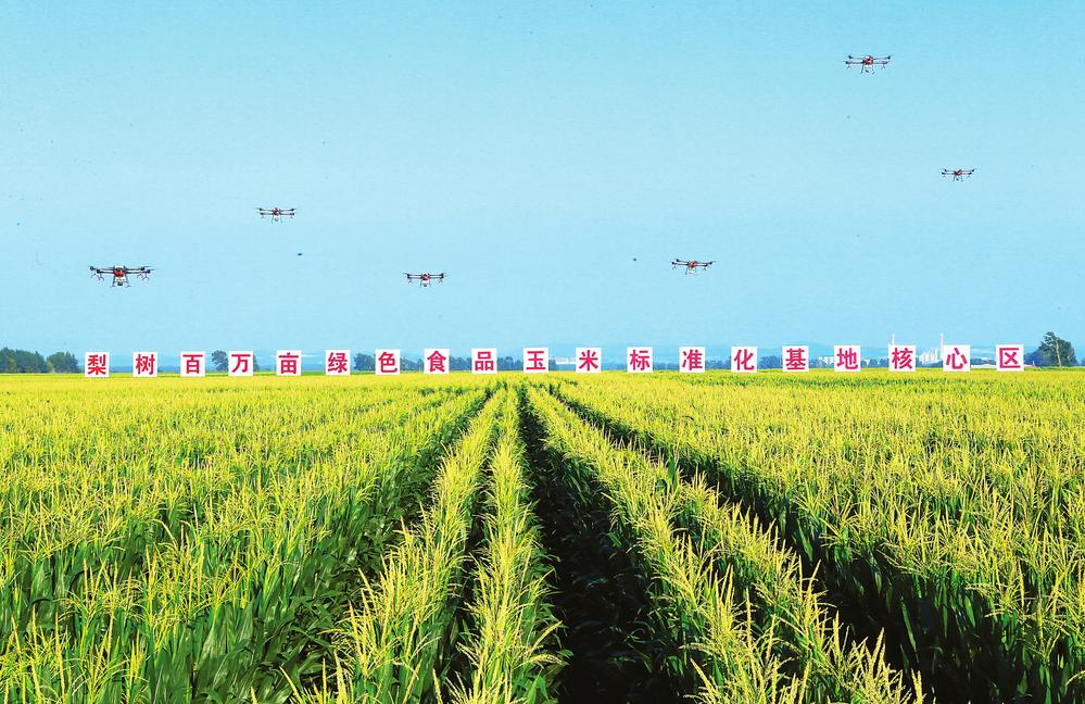 陽(yáng)光燦爛,晴空萬(wàn)里。一望無(wú)際的玉米抽穗揚(yáng)花,十余架植保無(wú)人機(jī)盤(pán)旋作業(yè)。站在田邊的高臺(tái)上眺望,希望的田野上生機(jī)無(wú)限。