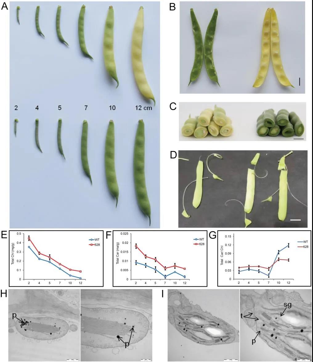 A:豆莢不同發育時期;B、C:豆莢內部及橫切表型;D:綠莢突變體多纖維表型;E、 F、G:豆莢葉綠素和類胡蘿卜素含量測序;H、I:豆莢葉綠體結構觀察
