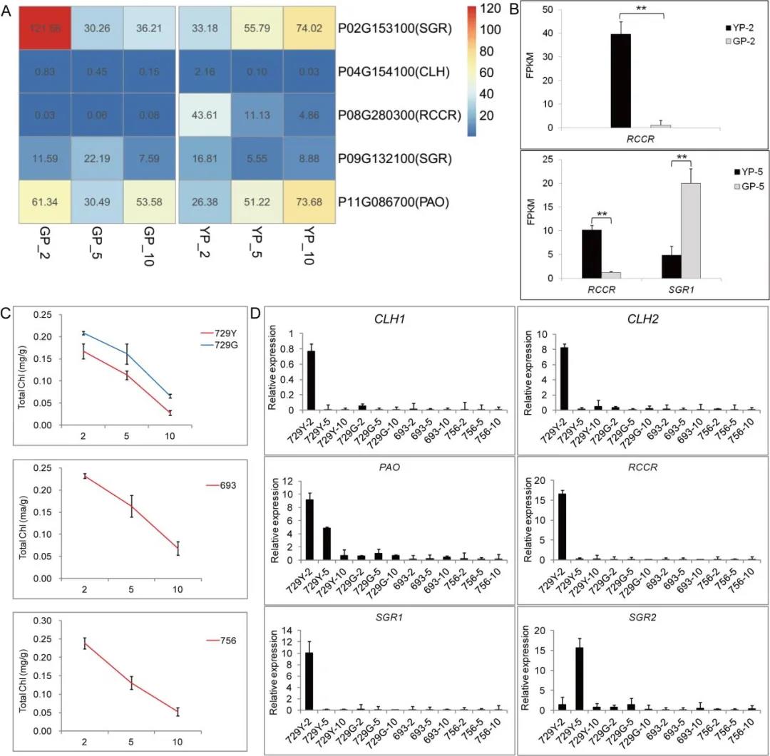 A、B:轉錄組測序揭示葉綠素降解基因表達變化;C:其他綠莢突變體M693,M756,M729豆莢葉綠素含量變化;D:其他綠莢突變體中葉綠素降解基因表達變化