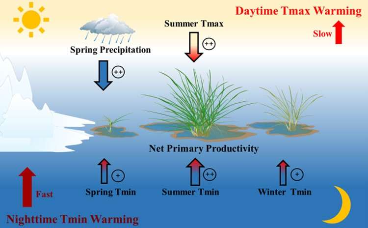 研究發(fā)現(xiàn),白天和夜晚升溫對青藏高原沼澤濕地植被NPP具有不對稱的影響。冬季和春季夜晚升溫能夠通過減少凍害的發(fā)生,在一定程度上增加青藏高原沼澤濕地植被NPP。在夏季,白天和夜晚升溫均會導致植被NPP顯著升高。