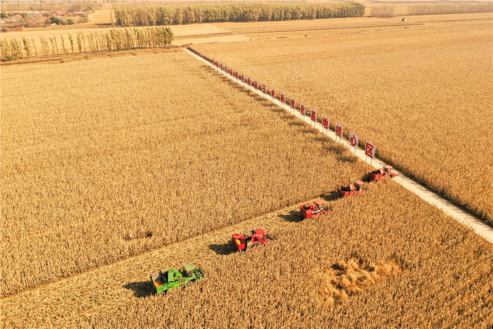 在吉林省梨樹縣國家百萬畝綠色食品原料(玉米)標準化生產基地核心示范區,農民駕駛農機進行秋收作業(無人機照片,2021年10月23日攝)。新華社記者 張楠 攝