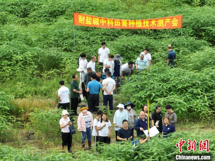 此次測產(chǎn)標志著由中國科學院遺傳與發(fā)育生物學研究所曹曉風院士團隊選育的耐鹽堿、肥飼兼用型中科田菁品系在貧瘠的重度鹽堿地也能高產(chǎn)。