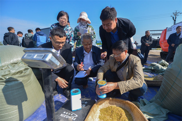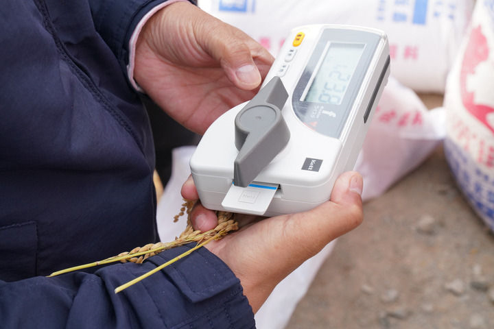 專家在黑龍江肇東東升村檢測耐鹽堿水稻的水分含量 王松 / 攝