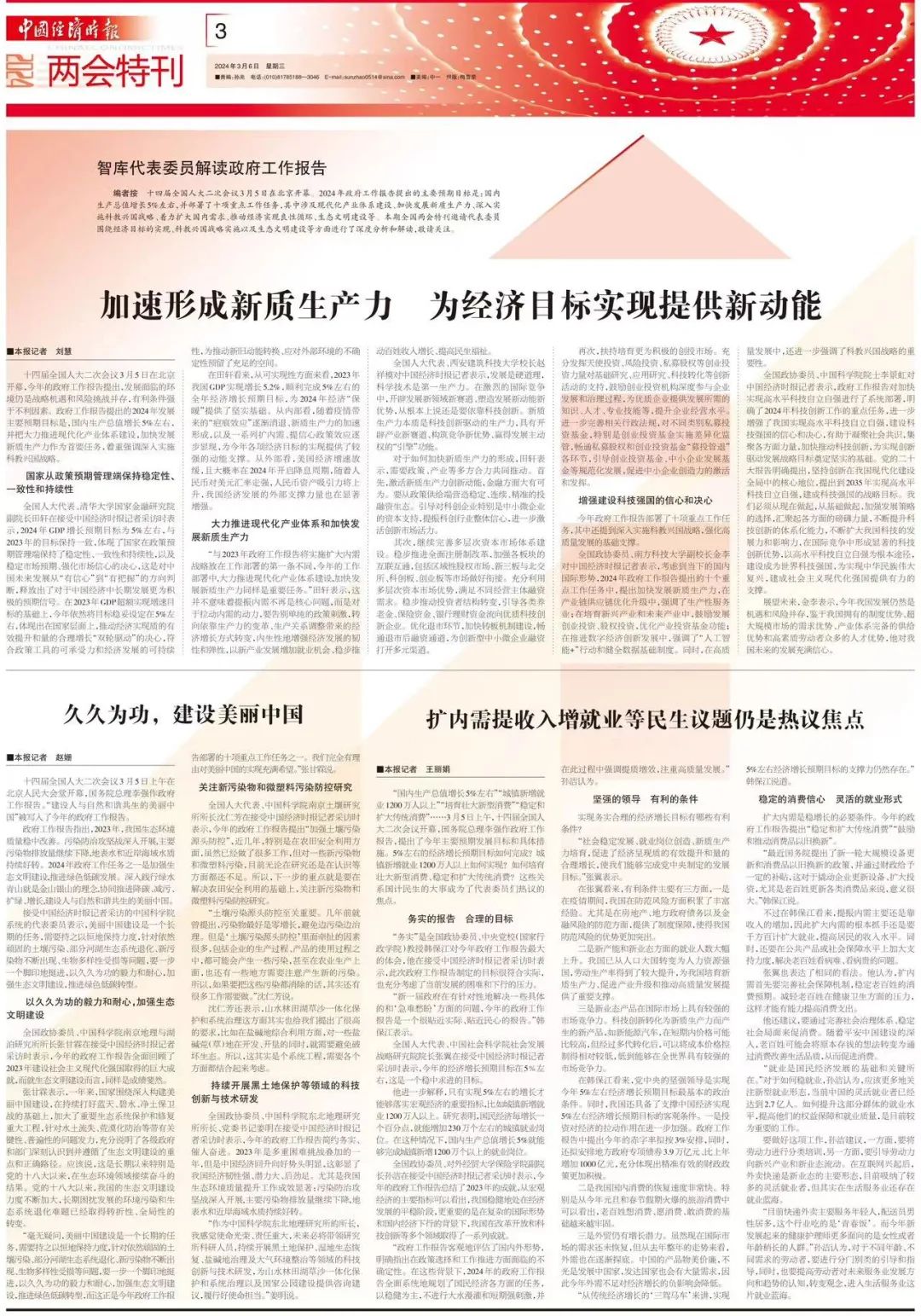 編者按?十四屆全國人大二次會議3月5日在北京開幕。2024年政府工作報告提出的主要預期目標是:國內生產總值增長5%左右,并部署了十項重點工作任務,其中涉及現代化產業體系建設、加快發展新質生產力、深入實施科教興國戰略、著力擴大國內需求、推動經濟實現良性循環、生態文明建設等。本期全國兩會特刊邀請代表委員圍繞經濟目標的實現、科教興國戰略實施以及生態文明建設等方面進行了深度分析和解讀,敬請關注。