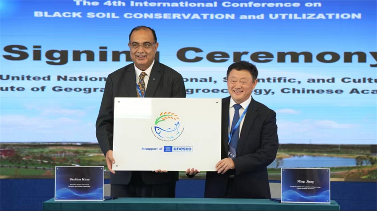 開幕式上,東北地理所與聯合國教科文組織東亞地區辦事處簽訂了合作意向書,與俄羅斯科學院索恰瓦地理研究所簽訂了合作備忘錄。聯合國教科文組織東亞地區辦事處主任兼代表Shahbaz Khan先生將“國際生物多樣性與糧食安全青年聯合會”的牌匾親手授予東北地理所所長姜明,進一步夯實了東北地理所與相關單位的國際交流與合作。