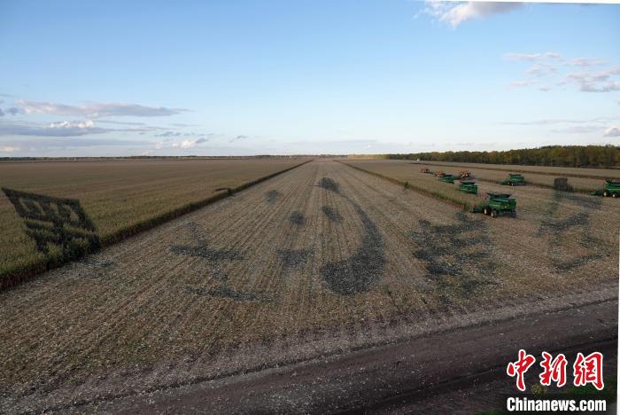 友誼農(nóng)場“萬畝大地號(hào)”上,農(nóng)機(jī)進(jìn)行作物收割作業(yè),場面壯觀。中新網(wǎng)記者 孫自法 攝