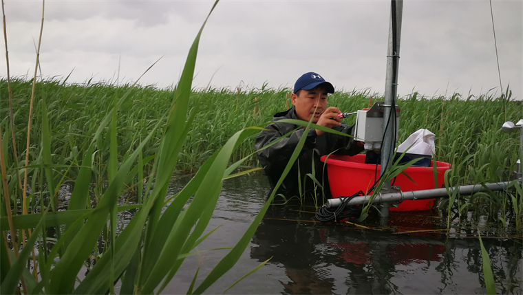 文波龍正在調(diào)試濕地生態(tài)特征和功能變化監(jiān)測(cè)裝置