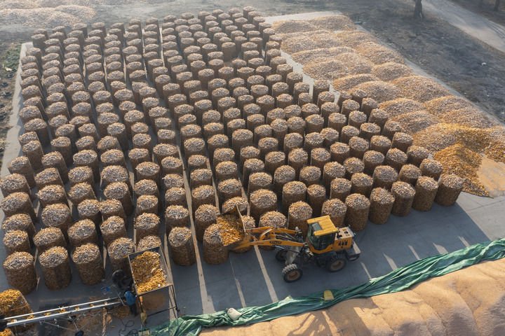 2024年11月13日,在黑龍江省肇東市一處秋糧晾曬場,海城雙麗現(xiàn)代農(nóng)機專業(yè)合作社的農(nóng)民駕駛農(nóng)機堆放玉米(無人機照片)。新華社記者 謝劍飛 攝