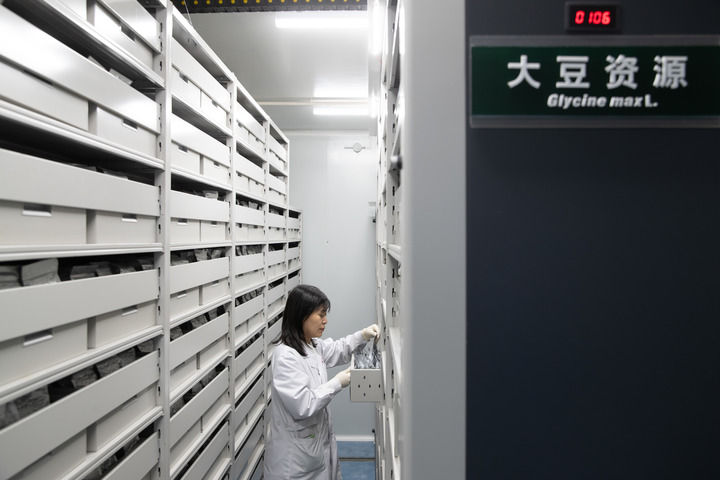 2024年4月2日,工作人員在國家寒帶作物及大豆種質(zhì)資源中期庫(哈爾濱)查看大豆種質(zhì)情況。新華社記者張濤攝