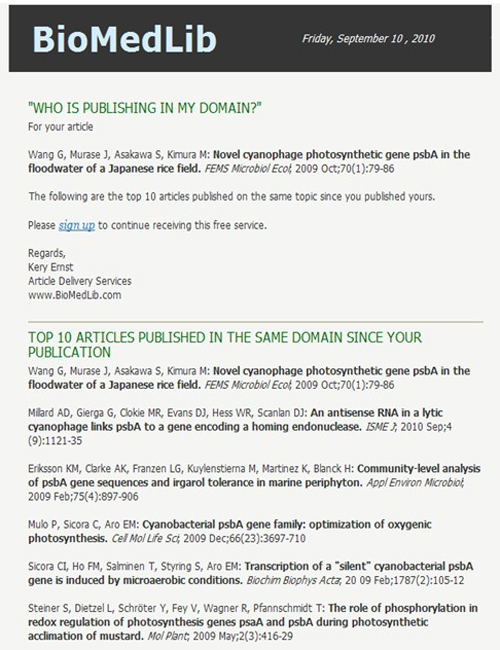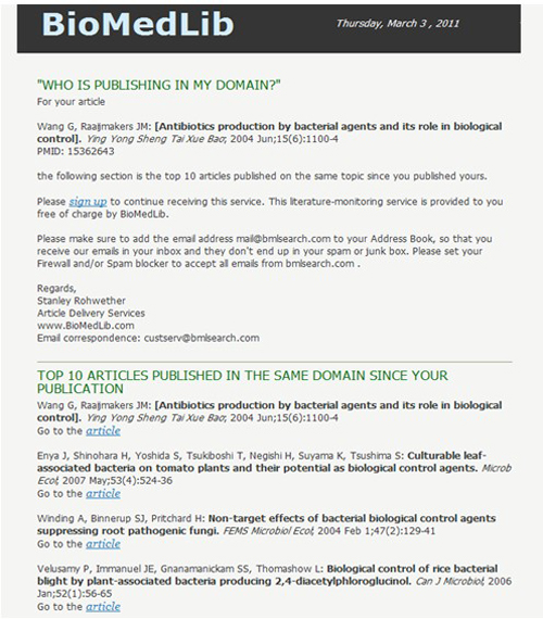 BioMedLib是生物醫學科技搜索引擎。在MEDLINE數據庫發表的上億篇生物醫學科技論文中,自動評測出相關領域中發表的十大最佳論文(Top 10 Articles Published in the Same Domain Since Your Publication)。我所王光華研究員于2004年發表在《應用生態學報》上論文“Antibiotics production by bacterial agents and its role in biological control”(2004, 15:1100-1104)和2009年發表在FEMS Microbiology Ecology上的論文“Novel cyanophage photosynthetic gene psbA in the floodwater of a Japanese rice field” (2009, 70:79-86)最近被評為同領域研究十大最佳論文。