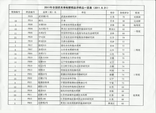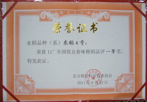 2011年8月21-24日,由北方稻作科學技術協(xié)會組織國內外稻米品嘗專家20人,針對來自全國各地參評的優(yōu)良粳稻審定品種,從米飯的氣味(香氣),外觀結構(米飯顏色、光澤、米粒完整性),適口性(粘性、軟硬度、彈性)和味道(滋味、純正性與持久性)四個方面進行單項7個等級進行評分,最后以綜合評分的平均值作為米飯食用品質感官評比結果,按照事先確定好的綜合得分85以上為特等獎,80-85分為一等獎,75-80分為二等獎,70-75分為三等獎,65-70分為優(yōu)秀獎的評選標準。經過評委們一天認真的品嘗,最終共評選出特等獎1個(與日本越光品種同為88分),一等獎2個,二等獎7個,三等獎5個,優(yōu)秀獎5個。我所培育的“東稻4號”水稻品種以80分的好成績獲得一等獎。
