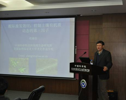 會議由劉殿偉副所長主持,首先,劉殿偉副所長代表何興元所長對程維信研究員的到來表示歡迎,并簡要介紹了程維信研究員的學術(shù)背景、學術(shù)成就、研究領域等基本情況。隨后,程維信研究員做了題為“根際激發(fā)效應:控制土壤有機質(zhì)動態(tài)的第三效應”的學術(shù)報告。他圍繞“開展根際激發(fā)效應研究的重要性”、“根際激發(fā)效應的主要研究方法”、“根際激發(fā)效應對土壤有機質(zhì)礦化速率的影響及其控制因子”以及“根系激發(fā)效應與土壤中其它養(yǎng)分的影響(包括氮、磷、鐵、鈣等)”等內(nèi)容及相關(guān)的研究工作做了詳細講解。通過多年研究,程維信研究員認為根、土互作與溫度和水分同等重要,是控制土壤有機質(zhì)分解的第三大因子。報告結(jié)束,大家就濕地、稻田中的根際激發(fā)效應、根際激發(fā)效應測定方法和不同土壤團聚體粒級間根際激發(fā)效應的差別等相關(guān)問題與程維信研究員進行了深入交流和探討,程維信研究員對大家的問題一一做了詳細回答,并期望將來能在相關(guān)研究領域與我所科研人員取得合作。
