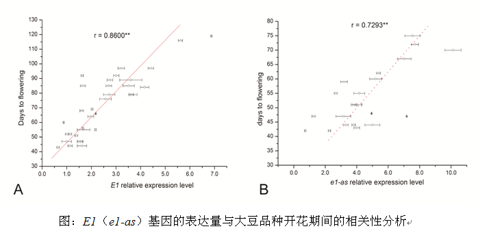 大豆分子育種重點(diǎn)實(shí)驗(yàn)室在成功地完成了大豆生育期基因E1、E2、E3及E4基因克隆的基礎(chǔ)上,選擇了180個具有代表性的大豆品種,同時在全國主要大豆生態(tài)區(qū)的六個試點(diǎn)對大豆的開花期(R1)與成熟期(R7或R8)進(jìn)行了表型觀察,對四個主要生育期基因進(jìn)行了基因型鑒定,其中E1、E2、E3與E4基因的隱性基因型比率分別為38.34%、84.45%、36.33%和7.20%。將我國大豆品種劃分為8個基因型類型,e1-nf、e1-asE4、E1-asE3E4、e1-asE2(E3)E4、E1、E1E4(E3)、E1E3E4和E1E2E3E4,其中E1E3E4為優(yōu)勢基因型,占26.1%,e1-nf型(E1功能缺失型)開花最早,而E1E2E3E4 基因型開花最晚。并且在研究中發(fā)現(xiàn)不同品種中E1基因的表達(dá)量與大豆開花期呈極顯著相關(guān),說明大豆許多已知或未知的開花位點(diǎn)可能通過調(diào)控E1基因來控制開花的。本研究為進(jìn)行深入研究大豆調(diào)控開花的基因網(wǎng)絡(luò)及開展分子育種提供重要基礎(chǔ)資料。