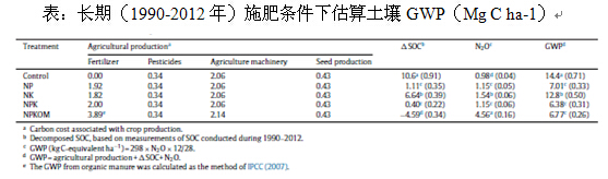 結(jié)果表明:在目前種植制度下,長期施用化肥導(dǎo)致土壤有機碳下降,增加了GWP。長期化肥配施有機肥NPKOM處理,土壤有機碳含量增加了4.59Mg ha-1,但是并沒有降低GWP。與其它施肥相比,化肥配施有機肥NPKOM增加N2O排放,平均增加2.9倍。NPKOM處理GWP(6.77 Mg C)與NP和NPK處理相比差異不顯著,但是顯著低于CK處理(14.4 Mg C)和NK處理(12.8 Mg C)。這表明,在中國東北黑土地區(qū),在雨養(yǎng)農(nóng)業(yè)生產(chǎn)條件下,化肥配施有機肥即增加作物產(chǎn)量,培肥地力,又降低GWP。這項結(jié)果將為黑土地區(qū)農(nóng)業(yè)生產(chǎn)合理施肥提供科學(xué)依據(jù)。