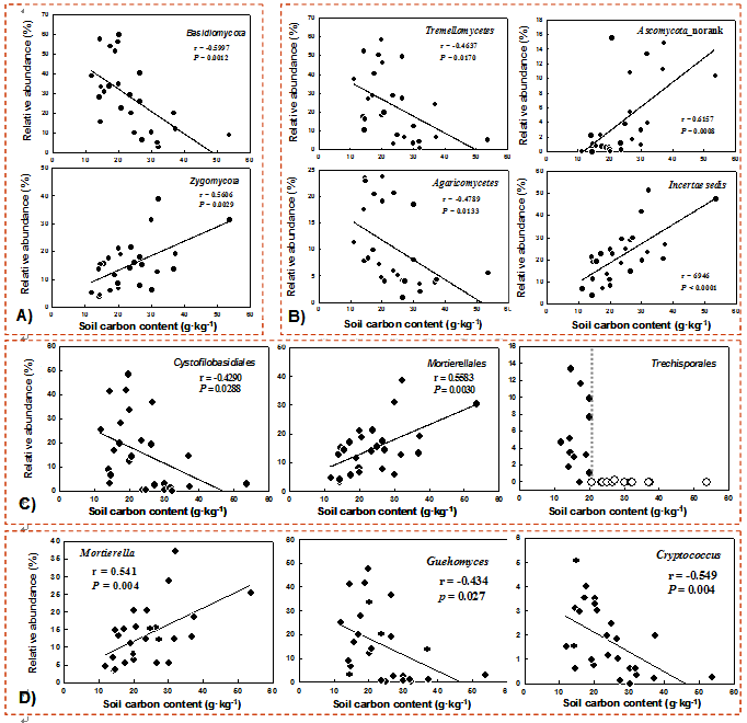 圖2 黑土農田真菌在門(A)、綱(B)、目(C)和屬(D)上的相對豐度與土壤全碳含量間的關系