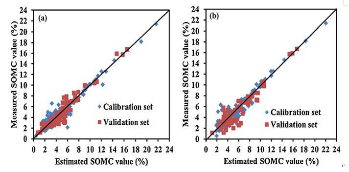 圖 2實測的土壤有機質含量與估算的土壤有機質含量之間的關系:(a)GRA-ANN方法和(b)ANN方法。