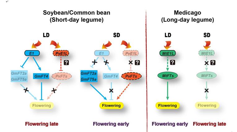 圖:豆科植物中E1基因家族調(diào)控開花模式預(yù)測圖。其中PvE1L為菜豆(common bean)來源的E1同源基因具有抑制開花的功能;MtE1L為蒺藜苜蓿(Medicago truncatula)來源的E1同源基因具有促進(jìn)開花的功能。