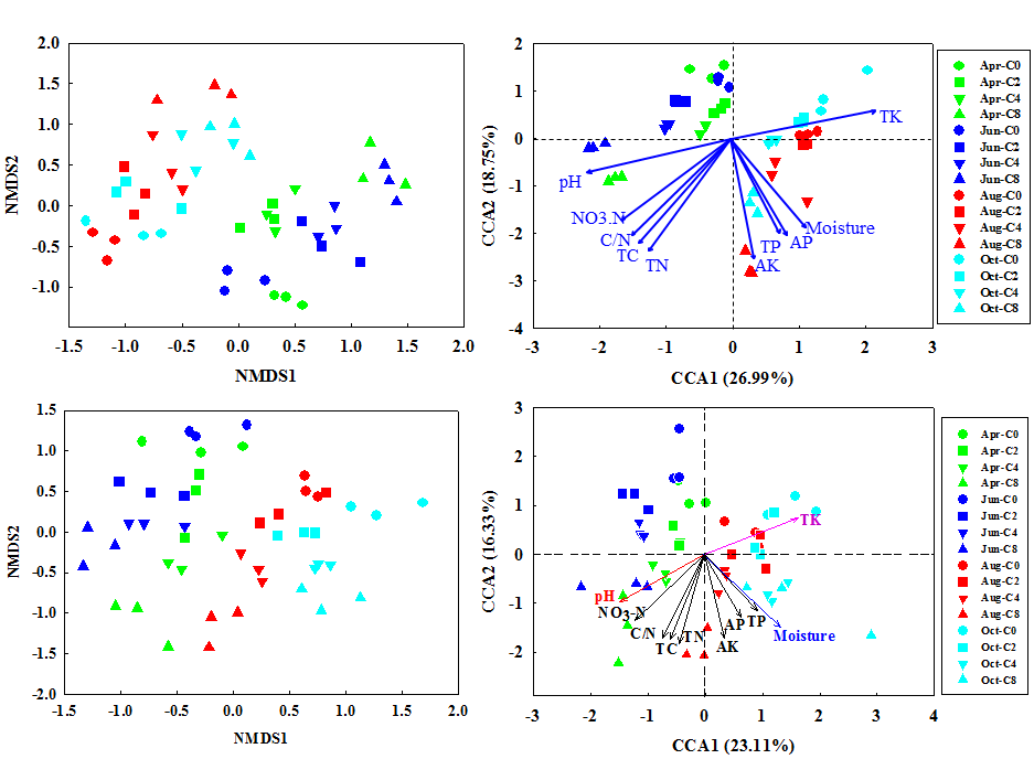 為此,東北地理所農田分子生態學科組于2012年建立了一個秸稈生物炭施用長期觀測研究平臺。生物炭按耕層土壤質量的0%、2%、4%和8%一次性混合施入土壤,大豆和玉米輪作種植,監測生物炭對土壤理化性質和土壤微生物的影響。項目組于2014年分4次采集耕層土壤樣品,解析土壤理化指標和土壤細菌和真菌群落變化情況。研究結果發現,生物炭施用3年后仍然對土壤理化指標產生明顯影響,表現為增加土壤全碳和全氮含量、增加土壤含水量、提高土壤pH值、降低土壤容重等。采用實時熒光定量PCR和Illumina Miseq測序技術對土壤細菌群落研究發現,添加生物炭增加了土壤細菌豐度,在門、屬和OTU等分類水平上均改變了細菌群落組成;發現施用生物炭增加了一些功能細菌的相對豐度,如芽孢桿菌屬(Bacillus)和土微菌屬(Pedomicrobium)等,而降低了慢生根瘤菌(Bradyrhizobium)相對豐度;CCA分析表明,土壤細菌群落結構變化與土壤pH、全碳、全氮和全鉀含量緊密相關。在土壤真菌群落結構研究方面,發現生物炭施用也增加了土壤真菌豐度,在屬和OTU水平上改變了真菌群落結構,但在門水平上沒有顯著影響;值得注意的是,生物炭施用降低了鐮刀菌屬(Fusarium)和黑粉菌屬(Ustilago)OTUs的相對豐度,說明施用生物炭有抑制有害植物病原菌生長繁殖的作用。CCA分析表明,土壤真菌群落結構變化與土壤理化指標,如土壤pH、含水量、TC、TN、TK和AK等密切相關。
