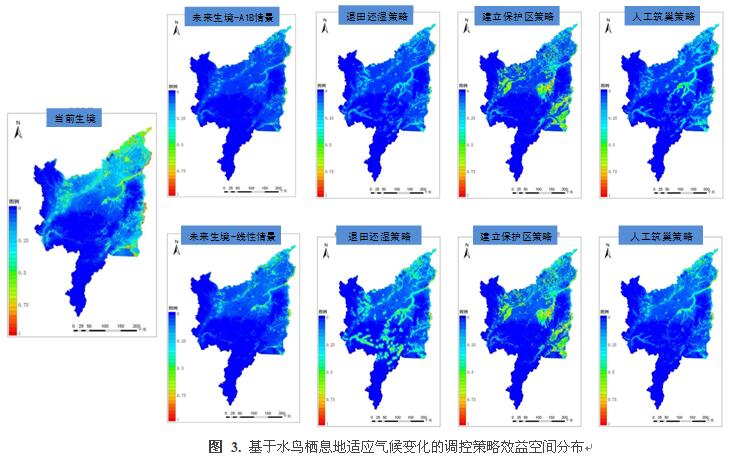 1.研究團(tuán)隊(duì)(1)首次構(gòu)建了針對(duì)濕地水鳥應(yīng)對(duì)氣候變化策略的理論研究框架(圖1);(2)揭示了當(dāng)今和未來氣候變化情景下東北地區(qū)三江平原東方白鸛棲息地適宜性的空間分布格局(圖2),表明未來氣候情境下棲息地適宜性分布面積嚴(yán)重下降;(3)揭示了不同氣候適應(yīng)性策略對(duì)棲息地應(yīng)對(duì)氣候變化的效益(圖3),研究顯示“退耕還濕”是最有效的適應(yīng)性對(duì)策,可以使適宜性生境面積提高十倍以上;“建立自然保護(hù)區(qū)”可以提高生境適宜性六倍以上;“人工筑巢”可以提高生境適宜性二倍以上。