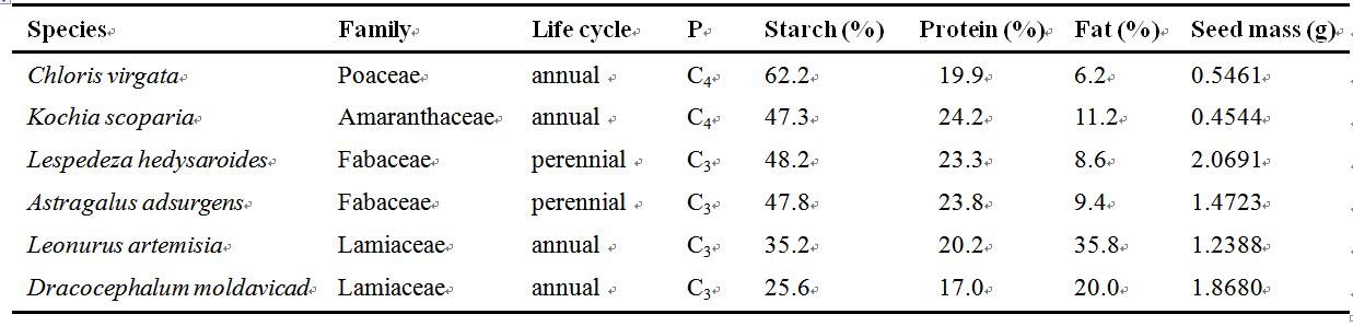 表1 六個(gè)物種所屬的科、生活型、光合途徑(P)、三大儲(chǔ)藏物質(zhì)所占的比例及種子千粒重