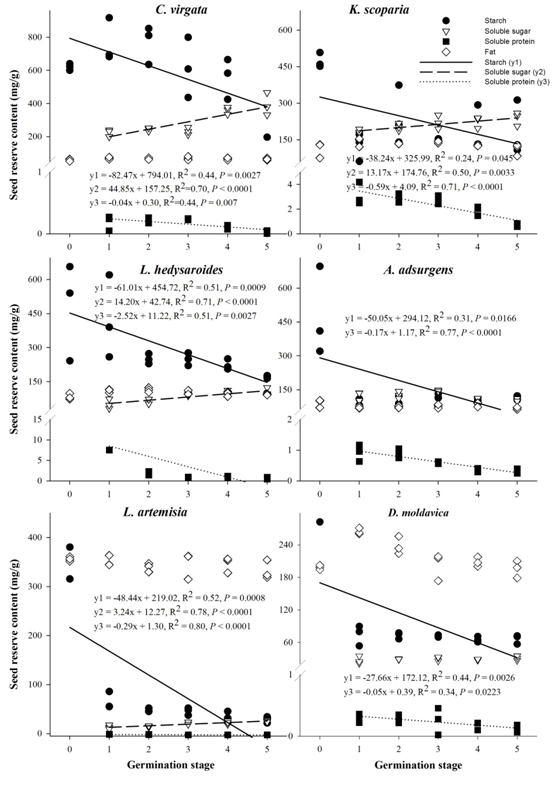 圖1 六個(gè)物種淀粉、脂肪、可溶蛋白、可溶糖含量在萌發(fā)過程中的回歸分析。0表示干種子,1表示吸脹,2表示1%萌發(fā),3表示50%萌發(fā),4表示最高萌發(fā),5表示早期幼苗階段。