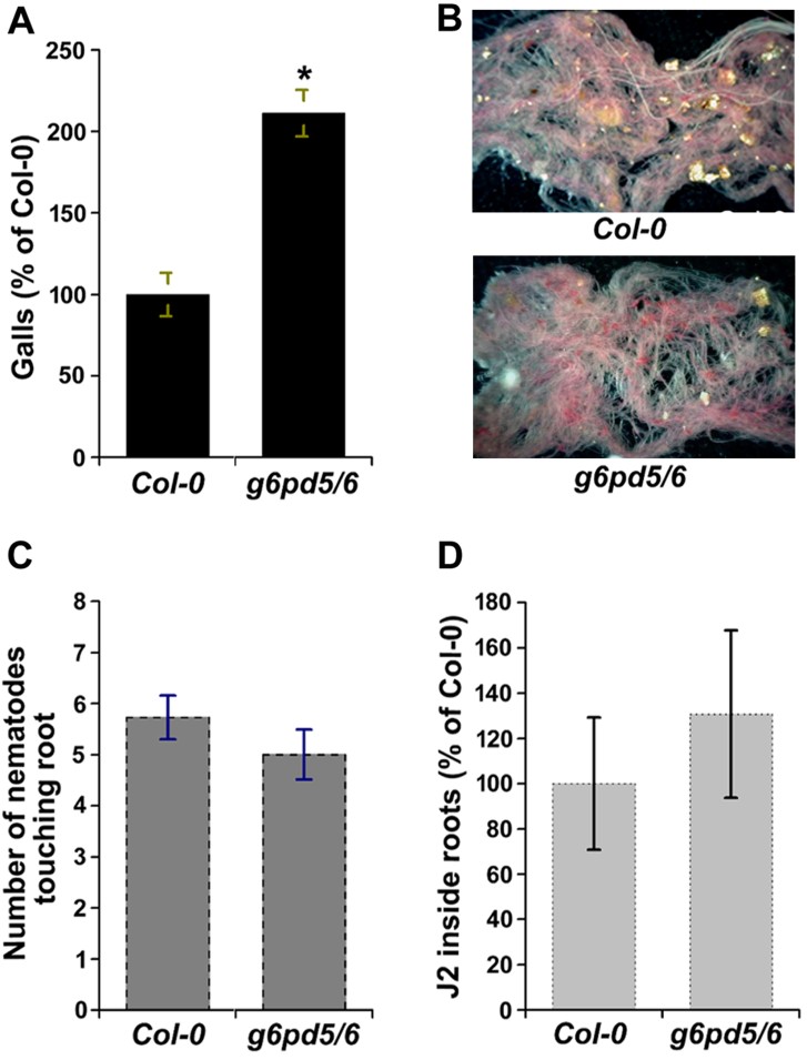 戊糖磷酸途徑(Pentose phosphatepathway, PPP)是植物體中葡萄糖代謝的重要途徑,可以產(chǎn)生大量的供還原性物質(zhì)合成之用的還原劑NADPH,其中間產(chǎn)物亦可作為底物原料參與核酸、氨基酸、脂肪酸等的生物合成。葡萄糖-6-磷酸脫氫酶(G6PDH)是PPP途徑的關(guān)鍵性調(diào)控酶,催化第一步不可逆的葡萄糖-6-磷酸氧化反應并嚴格控制著PPP途徑的代謝速率。已有的研究表明,在植物寄生線蟲的取食點細胞中發(fā)現(xiàn)葡萄糖-6-磷酸、果糖-6-磷酸、甘油酸-3-磷酸等中間物含量顯著上升,恰恰這些物質(zhì)是糖酵解途徑和PPP途徑共有的中間代謝物,暗示了PPP途徑可能在植物寄生線蟲與寄主互作中具有重要作用。為了驗證這一假設,農(nóng)田有害生物控制課題組利用模式植物擬南芥突變體、結(jié)合生理生化及細胞生物學等手段深入研究PPP途徑的關(guān)鍵酶G6PDH在根結(jié)線蟲與寄主植物互作中的生物學功能及其調(diào)控機制。研究表明,根結(jié)線蟲侵染導致寄主根內(nèi)G6PDH酶活性顯著升高(圖1);Western Blotting及基因表達分析顯示胞質(zhì)亞型G6PDH可能主要貢獻了總酶活性提高。和野生型相比,兩種胞質(zhì)亞型的功能缺失突變體g6pd5/6根內(nèi)G6PDH酶活性顯著降低,然而對根結(jié)線蟲的敏感性卻顯著增加(圖2)。進一步研究發(fā)現(xiàn),線蟲侵染后突變體根內(nèi)的ROS水平、基礎(chǔ)防御相關(guān)基因PRs及WRKYs的表達量明顯低于野生型。該研究證實了依賴G6PDH的PPP途徑通過激活ROS信號參與調(diào)節(jié)了植物對根結(jié)線蟲的防御反應(圖3),有助于我們從生理代謝水平更好地認識寄主與線蟲的互作機制,為選育抗植物寄生線蟲作物品種提供理論依據(jù)。