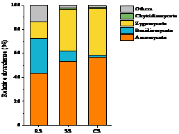 東北地理所土壤物質循環學科組科研人員以大豆-玉米-小麥輪作(RS),大豆短期連作(小麥-大豆-大豆)(SS)和大豆長期連作(CS)的大豆根圍土壤為研究對象,采用qPCR及高通量測序(MiSeq)技術,探索長期連作對大豆田土壤真菌豐度、群落結構和一些功能菌群的影響。結果表明:大豆長期連作土壤真菌豐度顯著高于大豆輪作和大豆短期連作(圖1)。大豆輪作和短期連作土壤中真菌優勢菌門是Ascomycota、Basidiomycota和Zygomycota,但長期連作土壤中Basidiomycota不再是優勢菌門(圖2)。主坐標分析(PCoA)顯示,連作對土壤真菌群落組成和結構影響顯著,長期連作和短期連作對土壤真菌群落影響也不同(圖3)。Lefse分析表明潛在的致病菌(Alternaria和Boeremia)在大豆短期連作中起主要作用,潛在的有益菌(Clonostachys、Metacordyceps和Metarhizium)在大豆長期連作中起主要作用(圖4)。進一步分析發現大豆連作后分別有10個潛在的致病菌和有益菌相對豐度發生顯著變化,大豆連作后致病菌相對豐度增加的同時有益菌相對豐度也在顯著增加(圖5)。