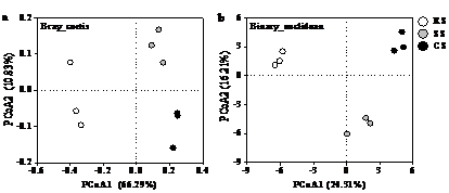圖3基于Bray(a)和Binary(b)距離矩陣大豆輪作和連作真菌群落的主坐標分析(PCoA)