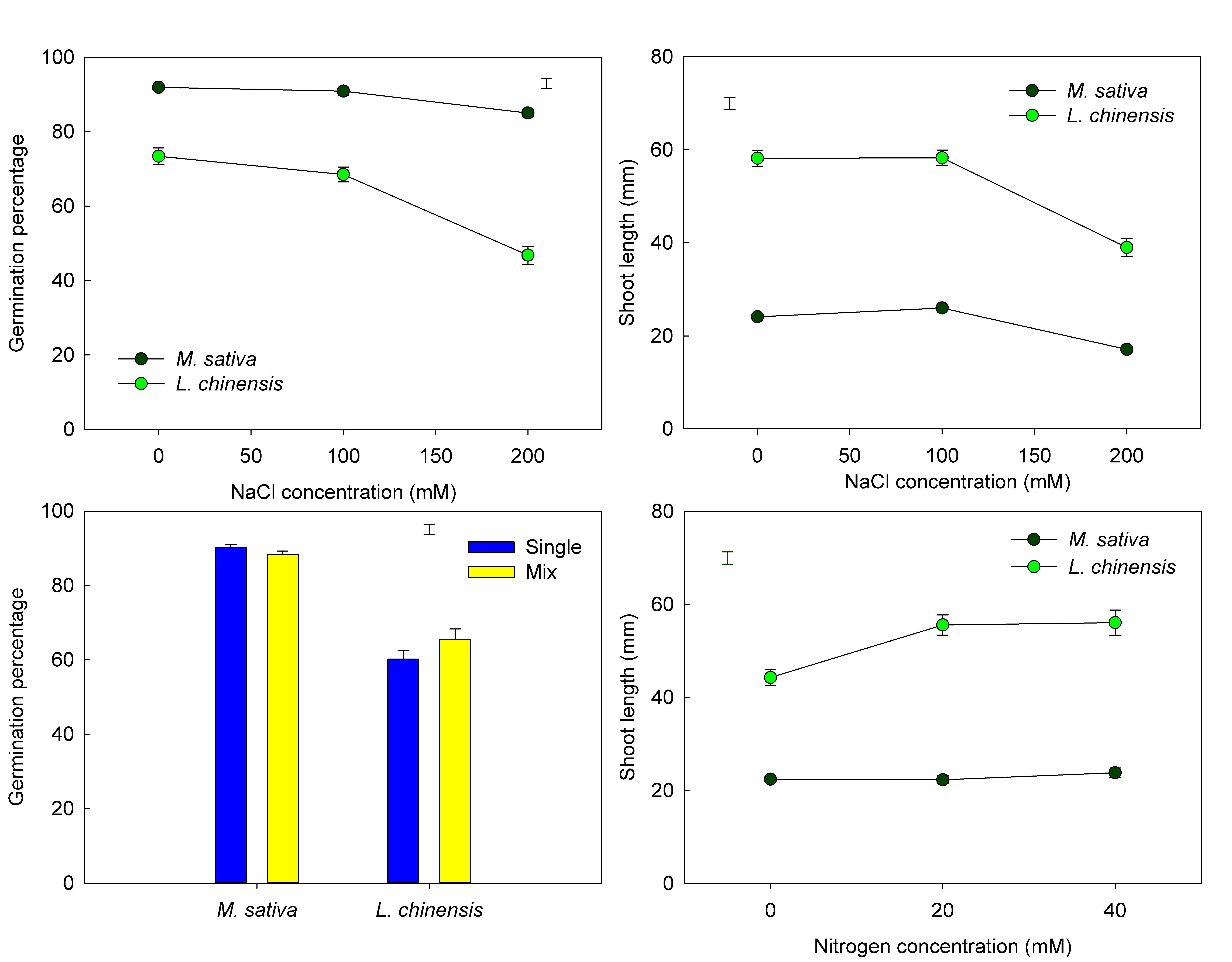 為了研究鹽和氮的交互作用對(duì)優(yōu)質(zhì)牧草禾本科羊草(Leymus chinensis)和豆科紫花苜蓿(Medicago sativa)早期生長(zhǎng)的影響,東北地理所草地農(nóng)牧業(yè)學(xué)科組科研人員開(kāi)展了一個(gè)2×2×3×3析因設(shè)計(jì)實(shí)驗(yàn),兩種牧草在三個(gè)鹽濃度(0、100、200 mM NaCl)、三個(gè)氮濃度(0、20、40 mM NH4NO3)單播和混播條件下進(jìn)行萌發(fā)。研究結(jié)果表明,混播和氮添加顯著增加氮敏感物種羊草的發(fā)芽率、發(fā)芽速度和幼苗高度,而對(duì)固氮植物紫花苜蓿種子的萌發(fā)和幼苗生長(zhǎng)影響不大(圖1)。苜蓿幼苗的鈉離子含量隨鹽濃度和氮濃度的增加而增加,氮含量保持相對(duì)穩(wěn)定;而羊草幼苗的鈉離字含量保持穩(wěn)定,氮含量在加氮條件下顯著增加。因此我們推測(cè)羊草和苜蓿混播條件下,苜蓿吸收鈉離子形成“微-生物治理micro-bioremediation”環(huán)境,使羊草吸收氮素作為養(yǎng)分和滲透調(diào)節(jié)劑,促進(jìn)其種子萌發(fā)和早期生長(zhǎng)。