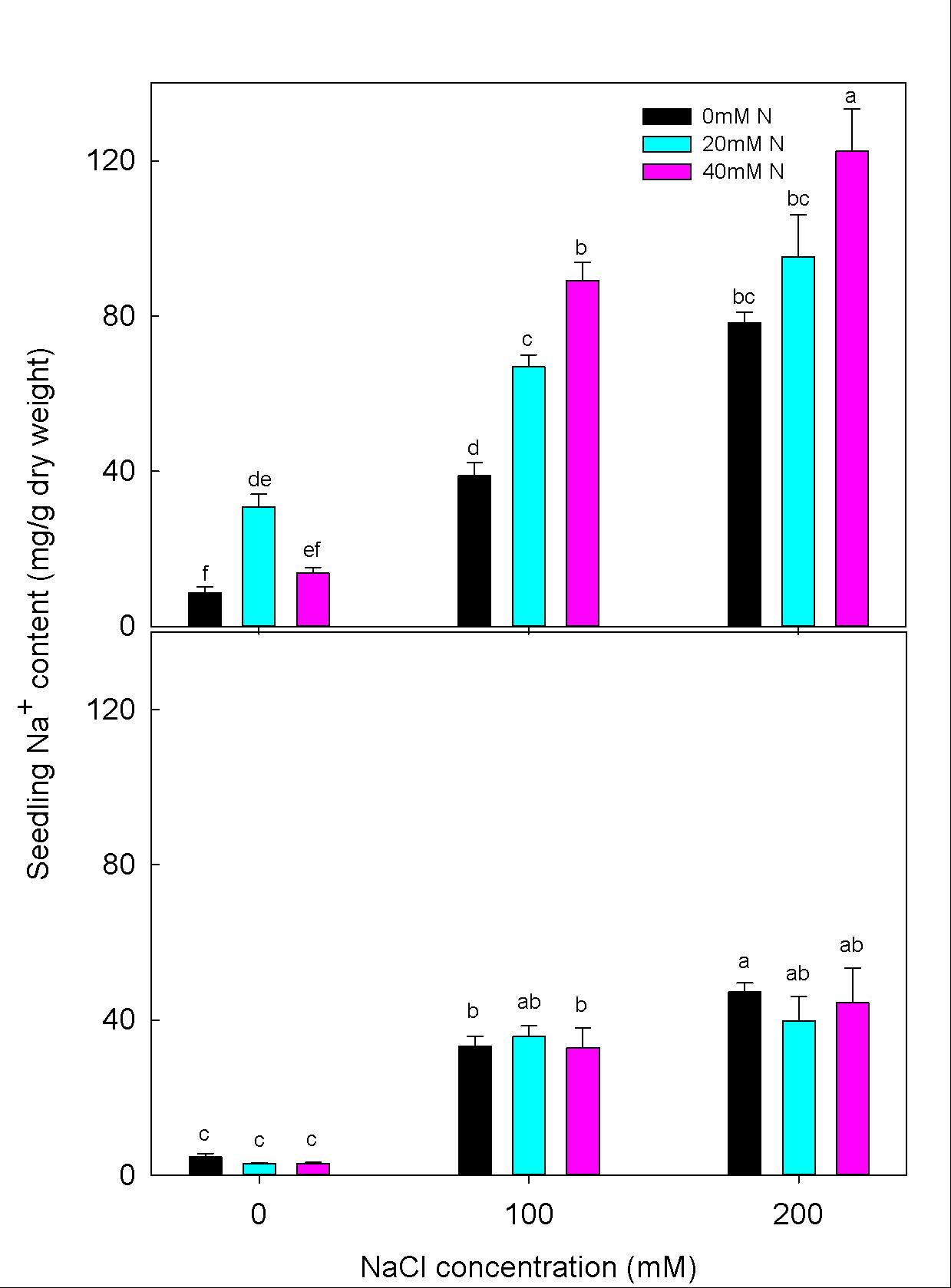 圖2 不同鹽和氮條件下羊草和紫花苜蓿的幼苗鈉離子濃度(a紫花苜蓿,b羊草)及氮含量(c紫花苜蓿,d羊草)。