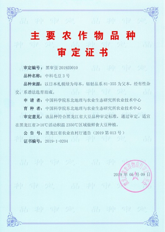 5月9日,由東北地理與農業生態研究所張秋英研究員研究團隊選育的“中科毛豆3號”(審定編號:黑審豆1019Z0010)、“中科毛豆4號”(審定編號黑審豆1019Z005)鮮食大豆品種順利通過黑龍江省農作物品種審定委員的審定。