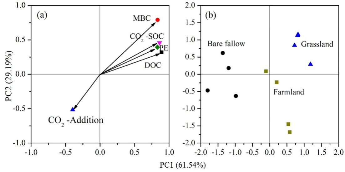圖1土壤有機質(zhì)來源CO2 (CO2-SOC),外源有機物質(zhì)來源CO2 (CO2-Addition),激發(fā)效應(yīng)(PE)與土壤活性碳組分(MBC,DOC)的主成分分析