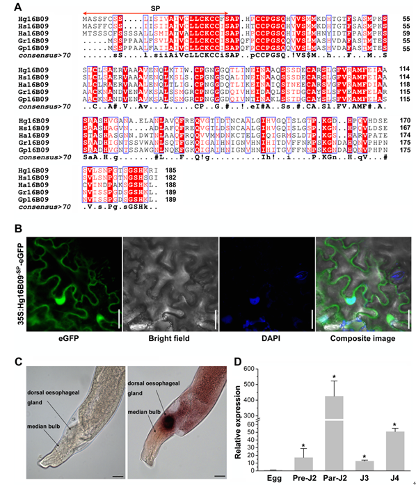 A.Hg16B09序列同源性分析;B. Hg16B09的亞細胞定位;C.Hg16B09組織表達特異性;D. Hg16B09在線蟲不同發育階段表達特征