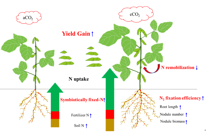 大氣CO2濃度不斷升高是全球氣候變化的重要環(huán)境因子,根據(jù)計算大氣CO2濃度已從工業(yè)革命前的270 ppm升高到目前的412 ppm(http://scrippsco2.ucsd.edu/#),預測到本世紀中葉大氣CO2濃度將升高到550 ppm,本世紀末達到700 ppm。研究發(fā)現(xiàn)大氣CO2濃度升高促進C3作物生物量提高,即肥料效應(CO2fertilization effect),但會導致植株氮(N)濃度降低,進而抑制產(chǎn)量的持續(xù)增加。大豆是對CO2濃度升高響應最敏感的作物之一,由于其本身具有共生生物固氮能力,理論上大氣CO2濃度升高可能顯著改變N吸收模式,進而影響CO2肥料效應。