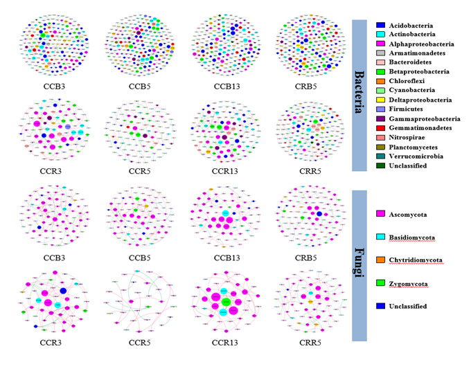東北地理所農田分子生態學科組基于大豆短期連作(3年和5年)、長期連作(13年)及大豆-玉米輪作等處理,采用高通量測序技術系統研究了東北區大豆連作障礙發生的微生物機制。研究發現,與短期連作相比,長期連作和輪作處理顯著增加了土壤養分含量、細菌和真菌多樣性指數而降低了土壤真菌與細菌數量的比值。發現土壤pH和C:N分別是驅動大豆連作下土壤細菌和真菌群落發生演替的主要影響因素。長期連作和輪作處理顯著增加了有益細菌Bradyrhizobiumsp和Gemmatimonassp的相對豐度,而顯著降低了病原真菌Fusariumsp的相對豐度(圖1)。此外,與短期連作相比,長期連作和輪作處理增強了細菌和真菌群落的網絡結構與穩定性。輪作處理中具有分解木質素和纖維素等有益細菌Bryobacter、Gemmatimonas和Terracidiphilus與真菌群落中具有抑制病原微生物生長的Trichoderma、Mortierella和Exophiala作為主要的關鍵微生物類群(Module hubs和Connectors),可能對改善土壤環境具有積極的作用(圖2)??傮w而言,大豆長期連作處理在微生物數量、多樣性指數及群落結構組成與短期連作處理差異顯著,但與輪作處理相似,說明大豆長期連作導致了土壤產生“抑病土”的微生物基礎。