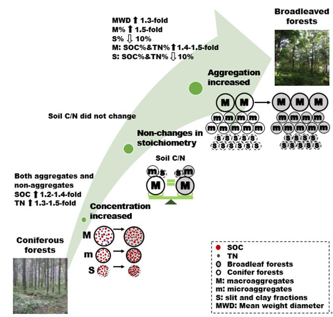 圖4. 針葉林轉變為闊葉林之后土壤有機碳和總氮累積的3個土壤團聚機制過程