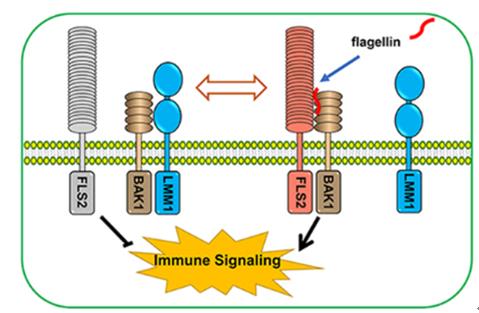 無病原菌侵入時,GmLMM1與病原體模式識別受體BAK1結(jié)合,免疫反應(yīng)被抑制;當病原菌(flagellin)侵入植物細胞后,可以誘導(dǎo)病原菌特異模式識別受體FLS2和BAK1結(jié)合,以觸發(fā)下游免疫信號。 GmLMM1在免疫激活過程中可以調(diào)節(jié)FLS2-BAK1相互作用,從而控制適度的免疫激活。