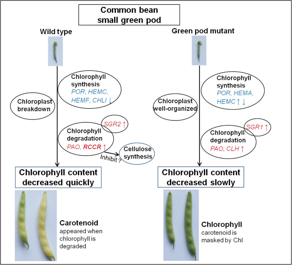 野生型黃金勾的豆莢隨著生長快速褪綠變黃,而在突變體庫中出現較高比例的綠色豆莢突變體,該突變體的豆莢顏色一直保持綠色。為研究黃金勾豆莢褪綠及類黃酮營養成分的變化,對3個發育階段的豆莢進行了轉錄組和代謝組測序。隨著豆莢的發育,葉綠素含量不斷降低,在野生型黃金勾中下降速率更快。對葉綠素代謝通路分析發現,葉綠素降解基因紅色葉綠素降解產物還原酶(RCCR)在黃金勾綠色小豆莢中高表達,而在綠色豆莢突變體中其表達量極低,推測該基因是黃金勾豆莢褪綠的關鍵基因。另一方面,綠色豆莢突變體豆莢質地較硬,烹飪口感差,通過對纖維素含量進行測定,發現綠色豆莢突變體中纖維素含量顯著高于野生型。且與野生型相比,綠色豆莢突變體中葉纖維素合成基因表達量上調。通過豆莢代謝組研究,共檢測到154種類黃酮物質,且隨著豆莢發育,多數類黃酮物質含量降低。在黃金勾中,柚皮苷,牡荊素-2-O-鼠李糖苷,異槲皮甙,槲皮素,山奈酚,紫云英苷和芒柄花苷含量較高。而木犀草素,芹菜素,李屬異黃酮,鷹嘴豆素,黃顏木素在綠色豆莢突變體中含量較高。該研究從生理和分子水平揭示了黃金勾豆莢褪綠的機制,并對豆莢發育過程中類黃酮物質進行代謝分析,為解析營養物質變化提供理論基礎。