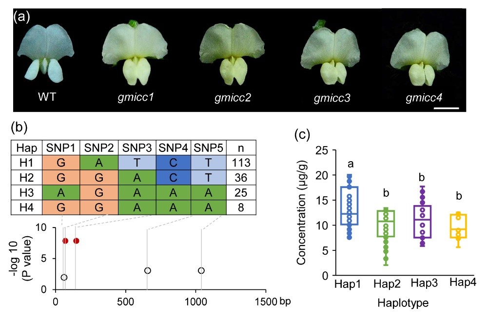 圖 1(a)4個大豆花色變黃且類胡蘿卜素含量升高的gmicc突變體株系(b)大豆存在4種GmCCD4的單倍體型(c)不同單倍體型中的類胡蘿卜素含量存在顯著差異