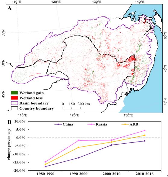 研究將面向對象和層次決策樹(HOHC)的分類方法應用于長時間序列的Landsat影像,獲得了1980至2016年間5個年份的土地覆蓋數據集。通過對濕地分布、變化及類型轉化分析發現,2016年黑龍江流域濕地面積為18.5萬 km2,占整個流域土地面積的9%。其中,俄羅斯一側的濕地占流域濕地總面積的59%,中國一側為40%,蒙古為1%。近40年間,黑龍江流域共損失了22%的濕地面積,1980-2010年間呈現持續凈損失,但2010-2016年間面積有所增加。人類活動主導了黑龍江流域中國一側濕地的持續損失,其中耕墾直接占用是濕地損失的最主要因素;建設用地擴張也在不斷的占用濕地,且占用量持續增加。相反,俄羅斯一側的濕地在1980-2010年間持續減少,在2010-2016年間呈現增加趨勢,主要歸因于氣候變濕驅動草地和林地向濕地的轉化。