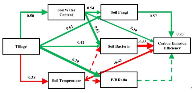 研究結(jié)果表明:正常年份免耕條件下土壤具有較低的土壤溫度(低約1℃),較高土壤含水量,同時(shí)免耕條件下的玉米產(chǎn)量和碳排放效率(產(chǎn)量與土壤CO2年排放量之比)比常規(guī)耕作處理降低22%和25%,只增加了播種前和生長(zhǎng)季后期(8-9月)的土壤微生物磷脂脂肪酸含量;干旱年份(2015年),免耕的土壤溫度(5、10、20 cm)比常規(guī)耕作低約2℃,土壤含水量顯著增加28%(圖1),并且顯著增加玉米產(chǎn)量(47%)、碳排放效率(63%)和生長(zhǎng)季節(jié)內(nèi)的土壤微生物磷脂脂肪酸含量。耕作處理間碳排放效率的差異主要是由作物產(chǎn)量引起的,因?yàn)闊o(wú)論正常年份還是干旱年份,免耕與常規(guī)耕作間的年土壤CO2排放量沒有顯著差異。結(jié)構(gòu)方程模型揭示了耕作方式通過土壤含水量、溫度、土壤真菌和細(xì)菌等間接影響碳排放效率(圖2)。另外,運(yùn)用FUNGuild評(píng)估土壤真菌功能發(fā)現(xiàn),免耕抑制了土壤中某些致病菌(Fusarium oxysporum, Alternaria sp),而使共生菌(Leptodontidium sp)的相對(duì)豐度增加(圖3),相關(guān)的研究結(jié)果發(fā)表在European Journal of Soil Biology(Wang Qian et al., 2021)期刊。這些結(jié)果表明免耕(保護(hù)性耕作)是東北地區(qū)連作玉米抗旱的一種積極應(yīng)對(duì)策略,并且不是以增加土壤碳排放和減低土壤微生物群落功能為代價(jià)。