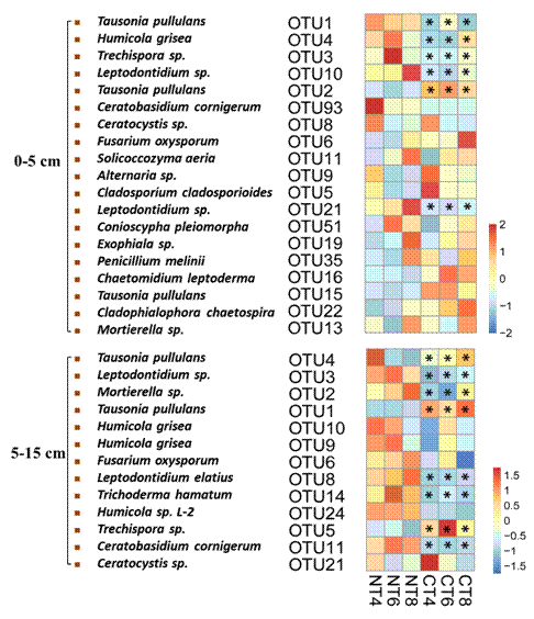 圖3 不同耕作處理下土壤優(yōu)勢(shì)真菌OTUs熱圖