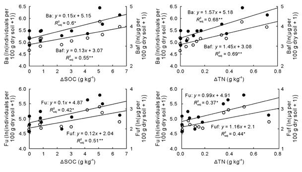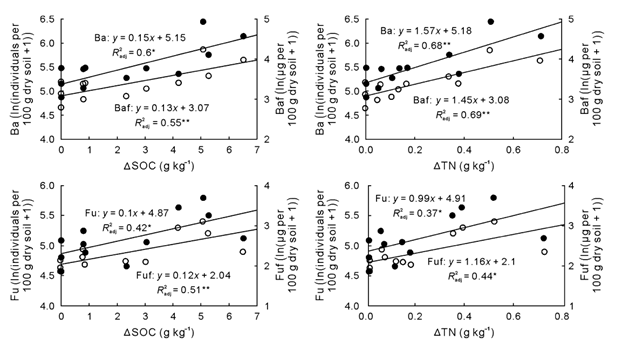 圖2 土壤線蟲豐度和代謝足跡與土壤有機(jī)碳和總氮增量的關(guān)系